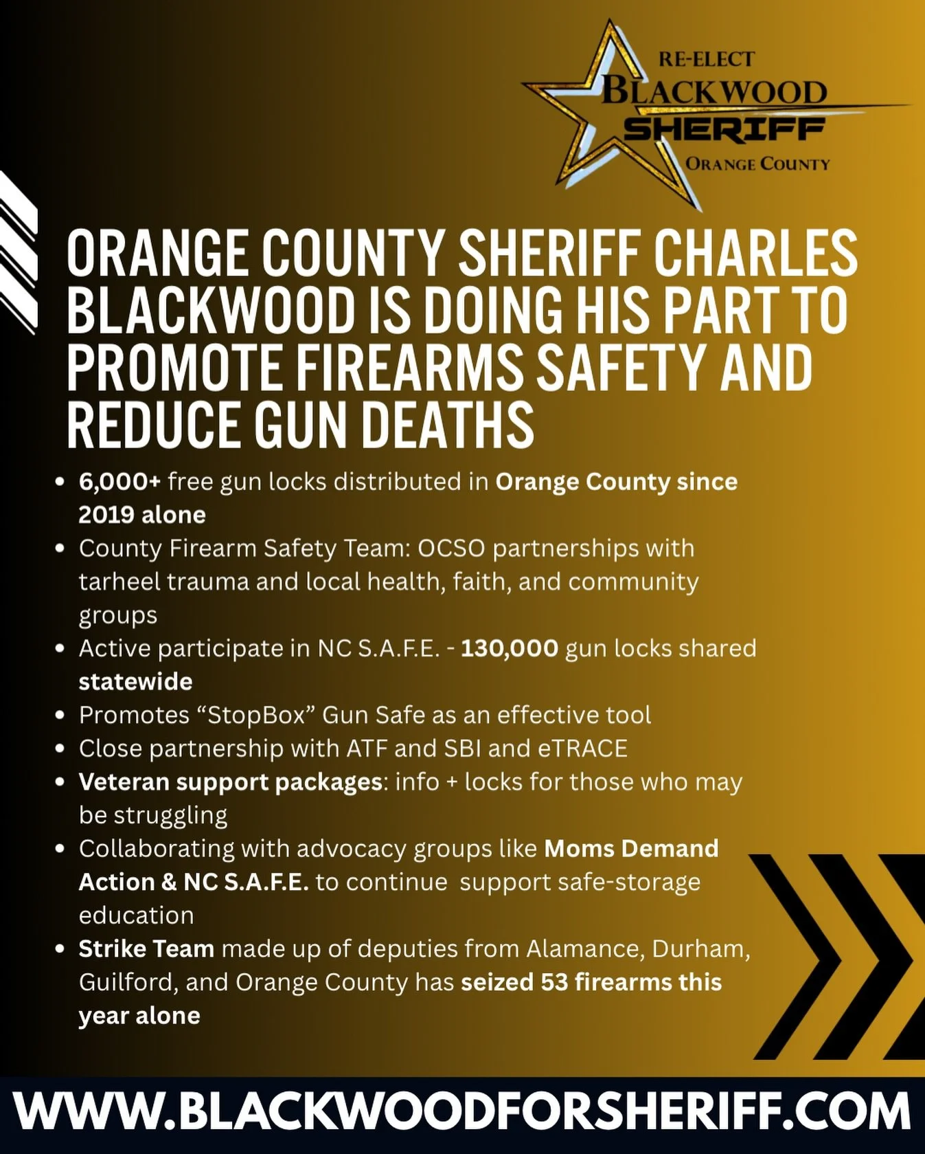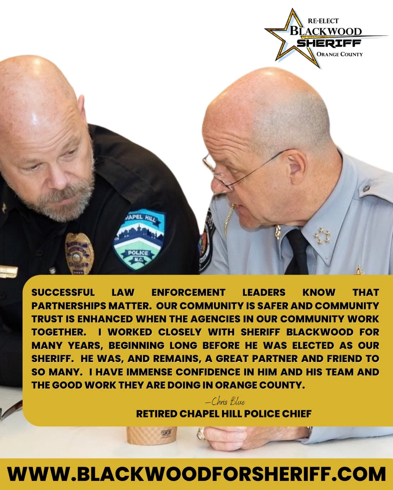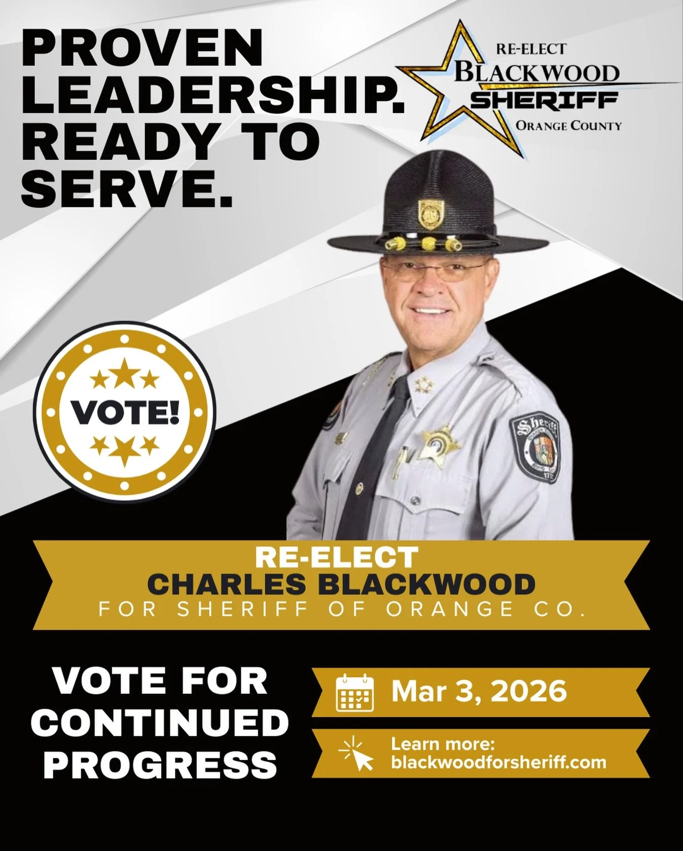 Sheriff Charles S. Blackwood is a 45-year veteran of the Orange County Sheriff’s Office, where he began his career in 1980 as a patrol deputy and rose through the ranks to become the 47th Sheriff of Orange County. Over four and a half decades of service, he has held leadership roles from Lieutenant to Major of Operations, retiring briefly in 2012 before being elected Sheriff in 2014. That same year, he was honored with the Order of the Long Leaf Pine, one of North Carolina’s highest awards for service.