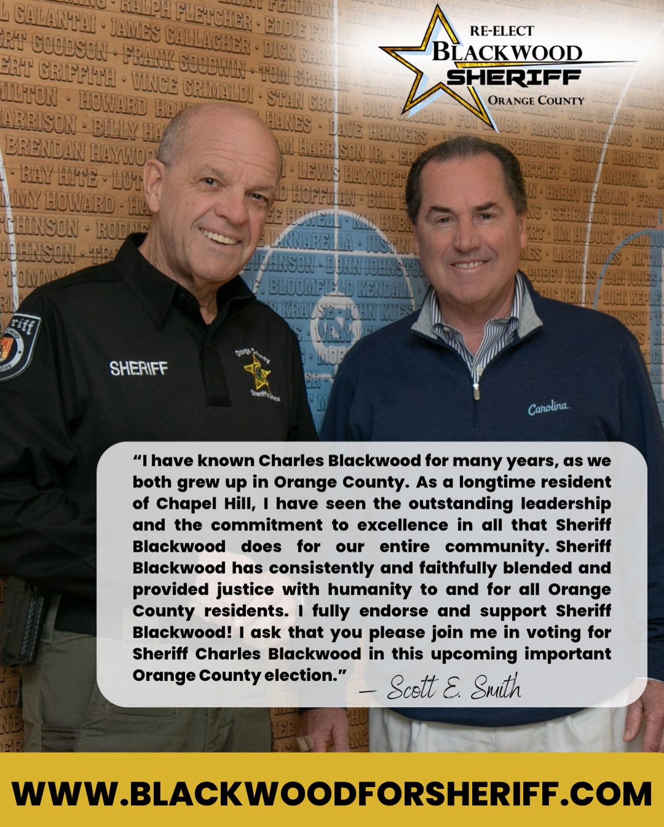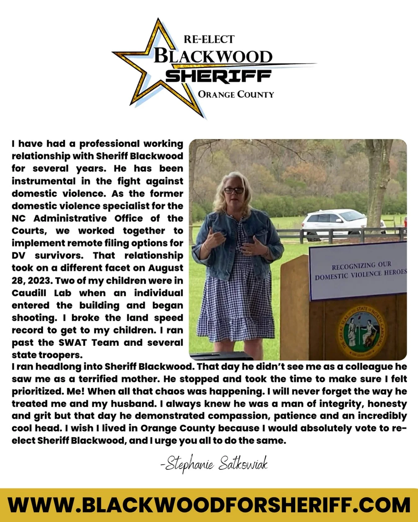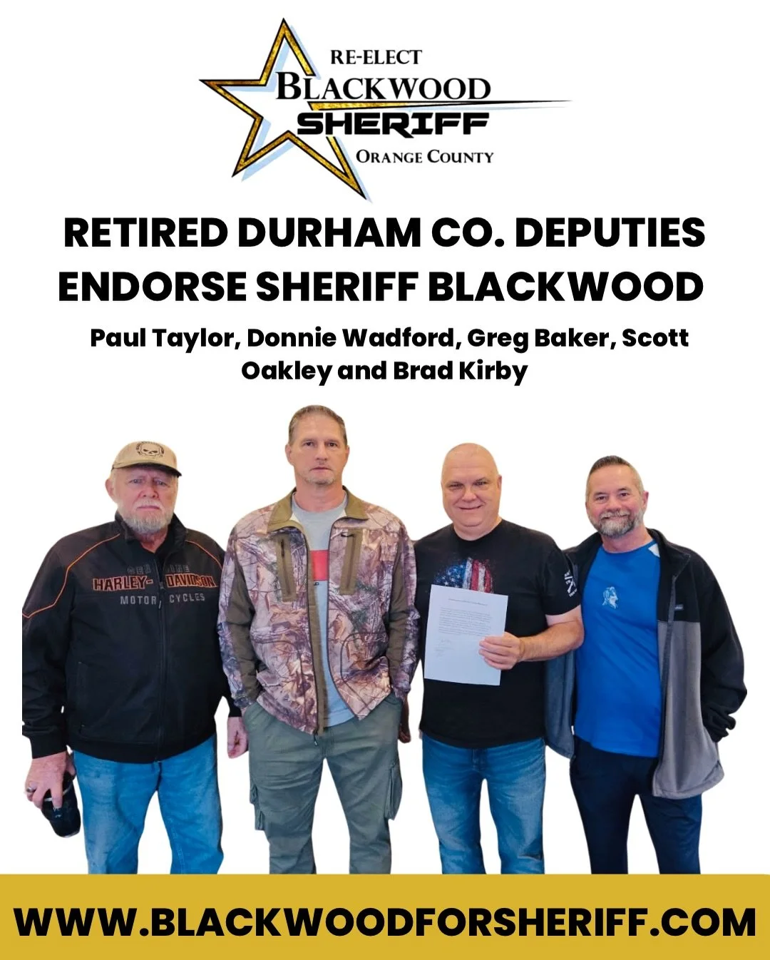 Sheriff Charles S. Blackwood is a 45-year veteran of the Orange County Sheriff’s Office, where he began his career in 1980 as a patrol deputy and rose through the ranks to become the 47th Sheriff of Orange County. Over four and a half decades of service, he has held leadership roles from Lieutenant to Major of Operations, retiring briefly in 2012 before being elected Sheriff in 2014. That same year, he was honored with the Order of the Long Leaf Pine, one of North Carolina’s highest awards for service.